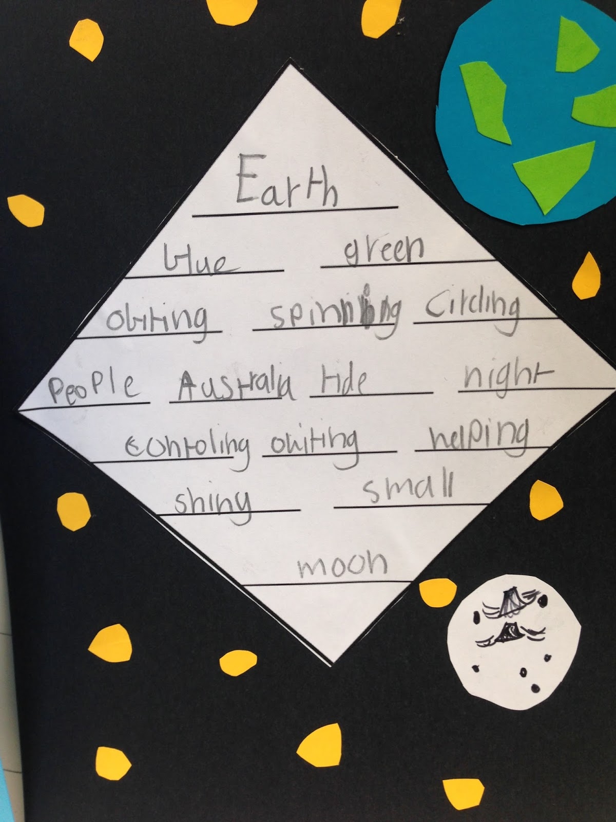Over the last few weeks the children have been learning about nouns, verbs and adjectives to support their poetry writing skills. Our focus has been writing Diamante Poems that relate to our inquiry projects. The structure of a Diamante poems is as follows: